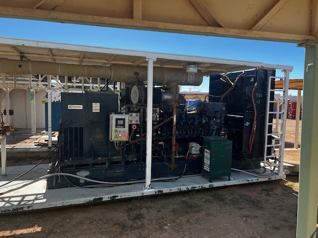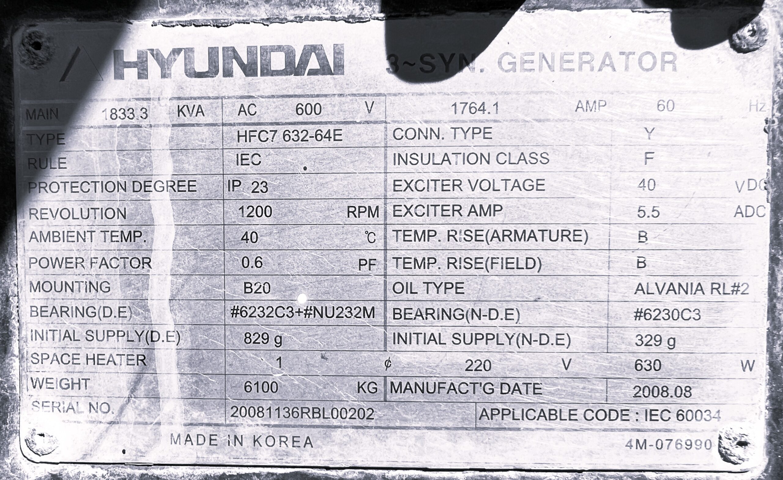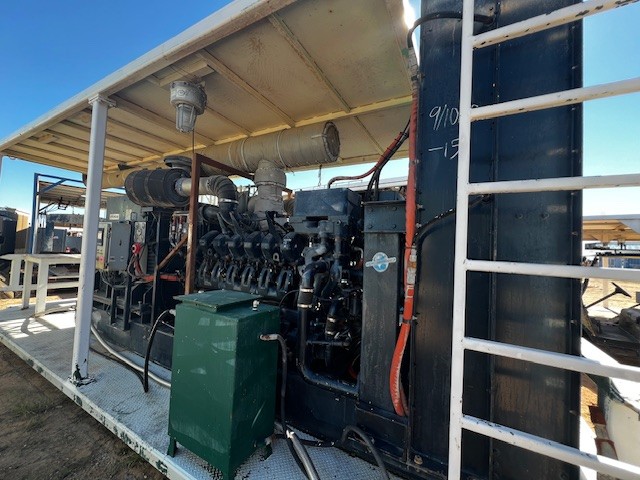 1500KW Hyundai HFC7632-64E Power 1833.3 KVA AC Generator, 1200RPM ; 60 hz; P/B DETROIT MTU 12V4000 Diesel Engine ; Engine Family 7MDDL95.4XTR; Tier 2; w/ Radiator, Air Starter, Gauges, etc. with a lot of extras 4′ x 8′ Workbench & Vise, All on 10’W x 28’L Covered Skid. CALL FOR DETAILS
