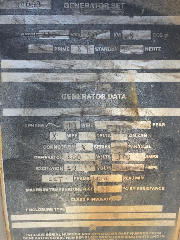 CAT G3406 SITA Gen Set, AR No. 102-9392, Perf Spec 2T8593, Power 329 Hp, Rocore RAD; Deep Sea Panel with compliance controller; Breaker panel, Propane Kit; Over All Base Skid Dimensions 96″ W x 232″ L x 110″ H, Generator Skid 59″ W x 144″ L x 7′ 18″ H, No EMC