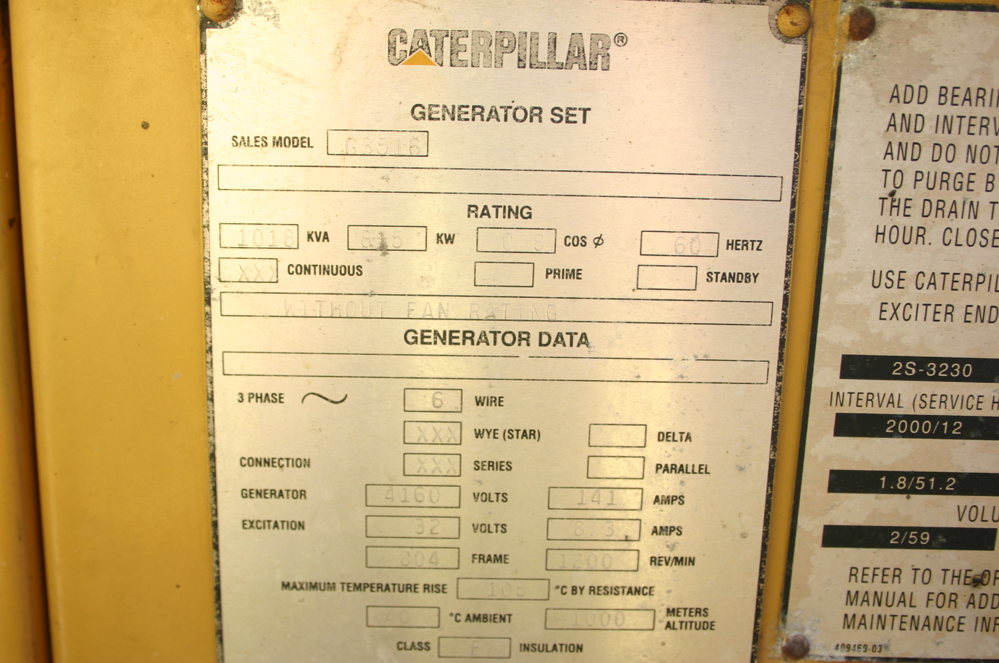 G- 800kw Cat 3516 Gas Gen Set p/b CAT G3516 Gas Engine S/N 4EK01065; Arrg #4P-8346; Spec #2T-7662; Built 8/96; 815kW@1200RPM; Dual 24V Elec. Start; Woodward 0611 Governor; Generator – CAT SR4 S/N 8ZD00791; 815kW/1018KVA, Continuous Rating; Single Bearing; 1200RPM; 60Hz; 4160V; 141A; PF-0.8; frame Size: 815; 105* Temp Rise; 6 Wire; Low Feet; 10-gauge Panel; Pre-lube; CAT rails. Running take out with high hours, would make inexpensive rebuilds