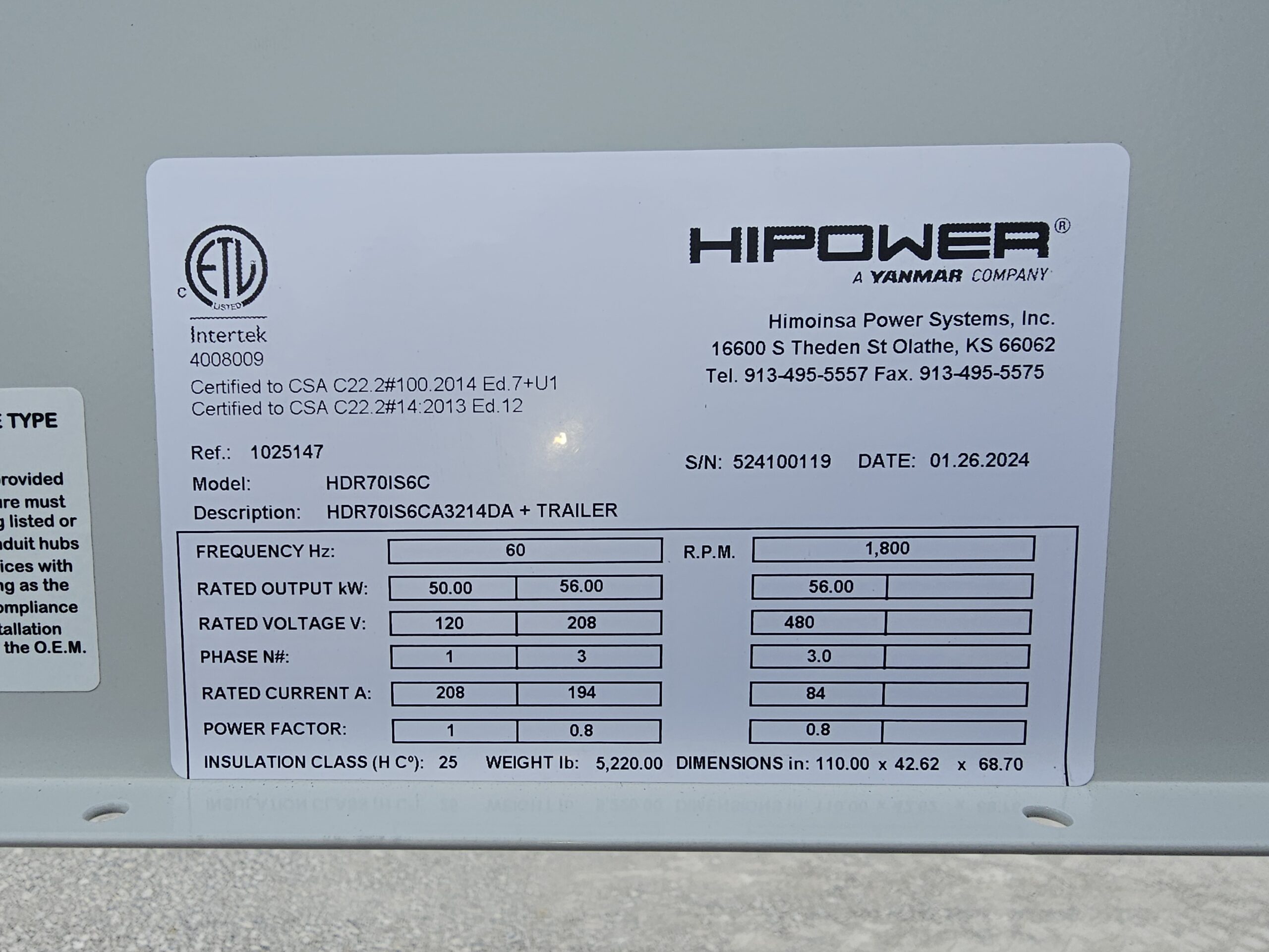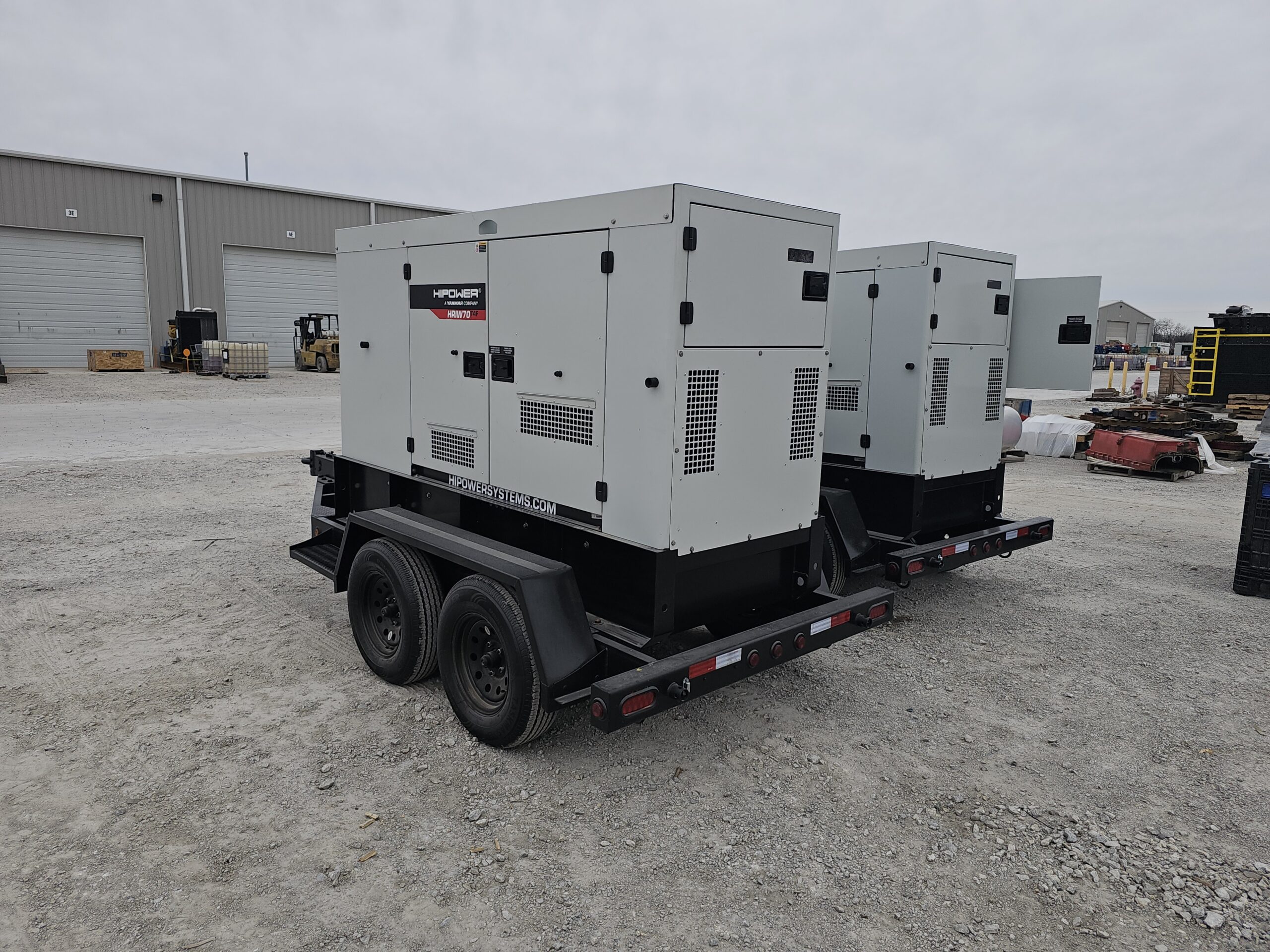70KVA HI POWER PORTABLE HDR-70 524100119; 56KW Prime, 62KW Stdby; powered by Isuzu 4JJ1X ; 28hr fuel tank; 3-way valve ; Stamford Brushless PMG Excited, 3 way Selector; Digital Controller for Parallel; Tandem Axle trailer with Surge brakes