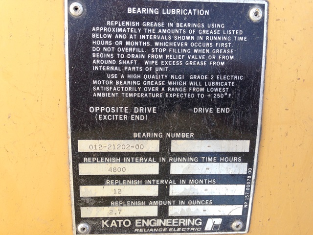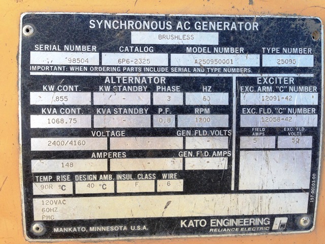 Generator -High Voltage 855kw KATO Prime, Catalog 6P6-2325, Model A250950001, 3 Ph., 60Hz, 0.8 PF, 1200 RPM, 2400/4160 V, 90* C Temp Rise, 6 Wire, SAE#OO; Medium hr. runner, Single Bearing; Runner
