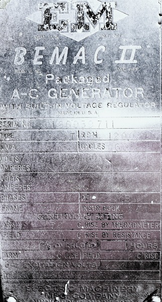 Generator 300KW, 1200RPM; converted to #0 via adapter ring; BEMAC II, SN 166959711, Brushless, 240/480V, PF .8,375KVA; 70*rise;. recent dipped at B&L; CAT 353 Gen End