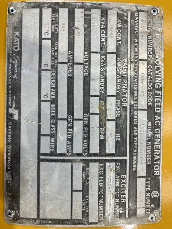 - 1050KW KATO; 6P6-3150; Two- Bearing; 347/600V; serial # 84038-3; 1200 RPM / Rebuilt; Apollo -Houston; 4-1-26 READY