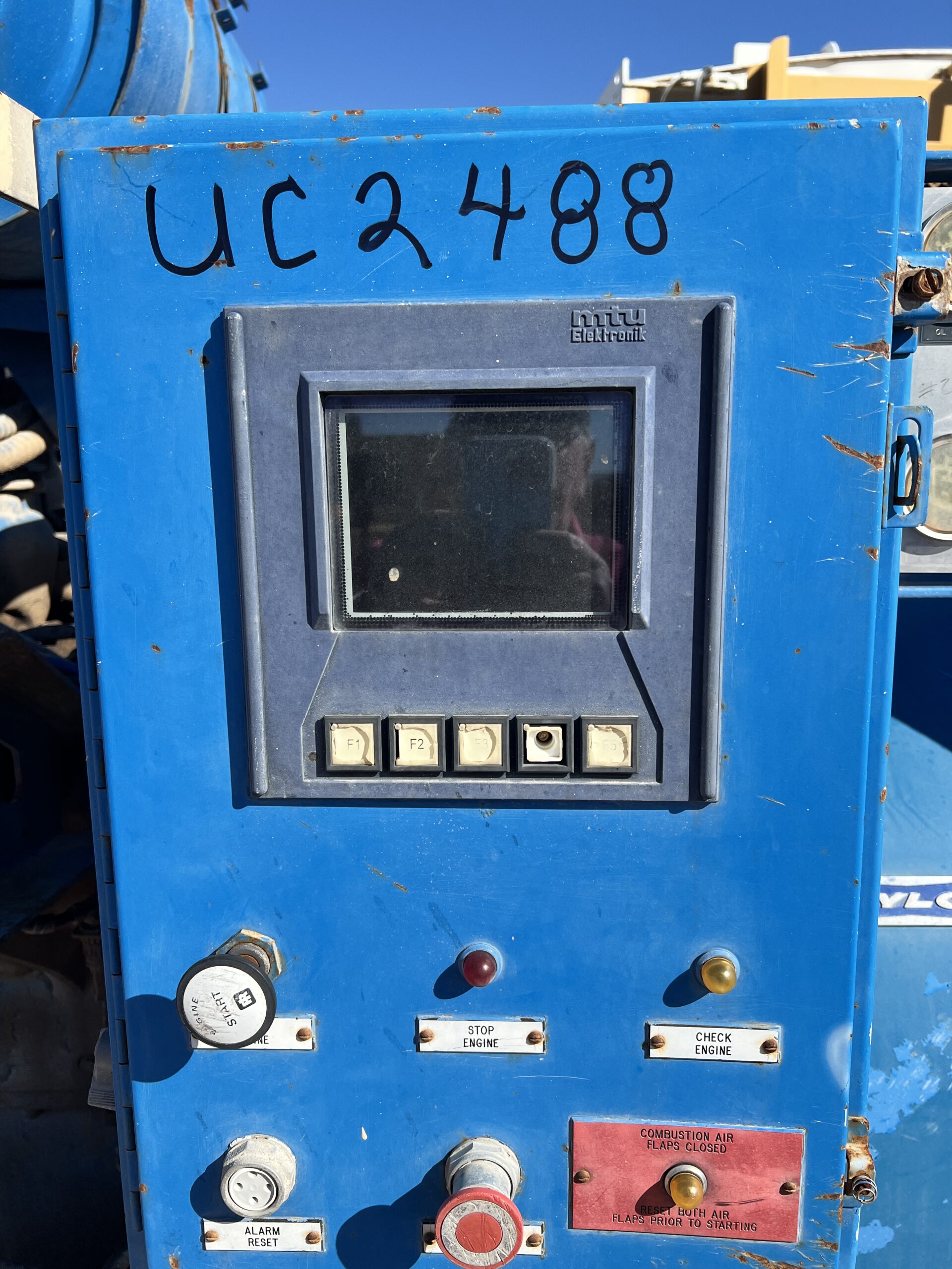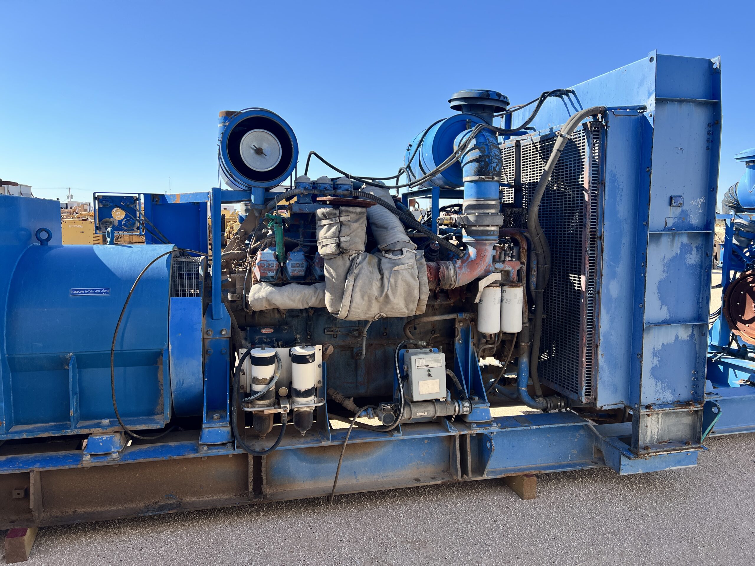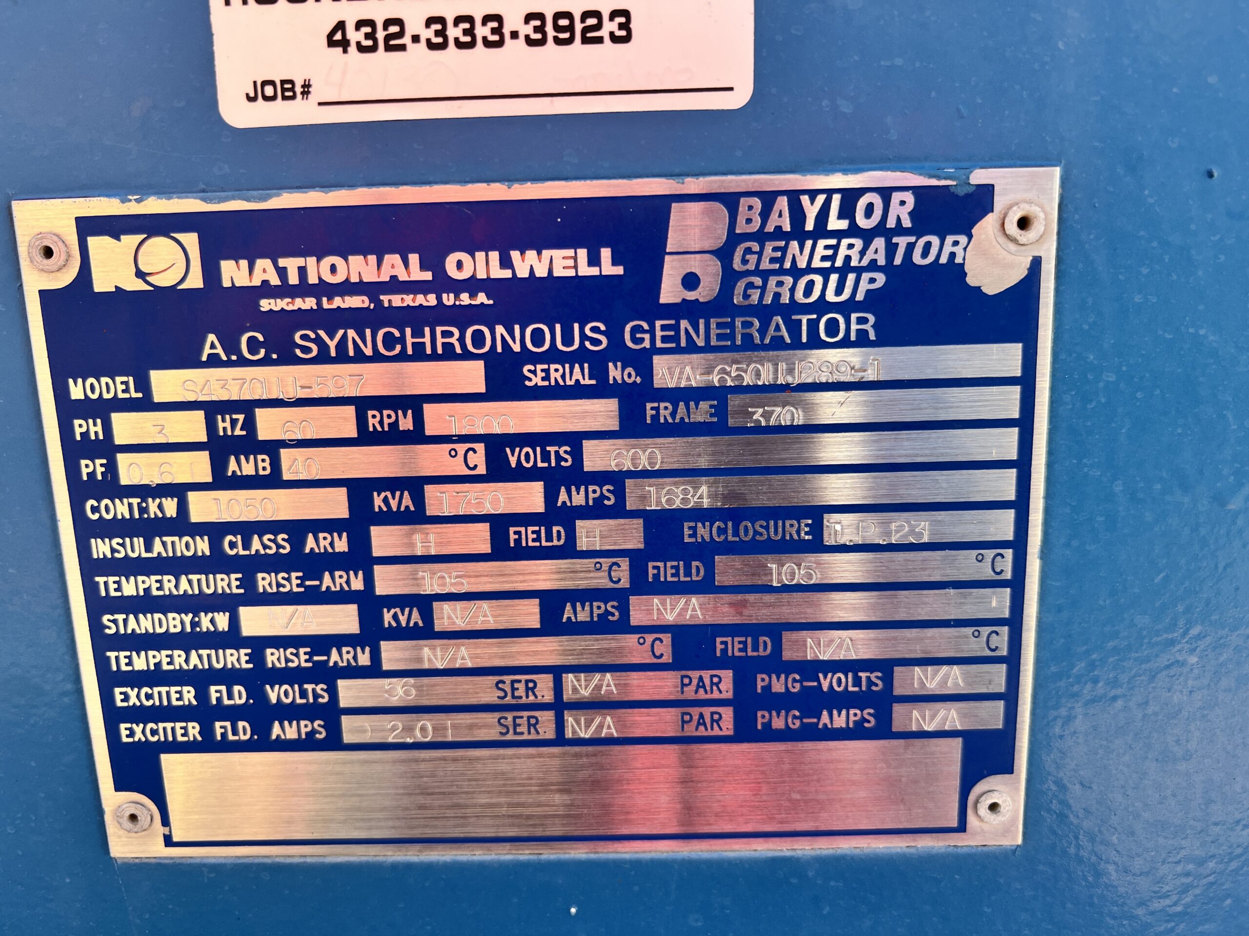 MTU DETROIT MTU 16V2000 Diesel Eng, BAYLOR 1050KW AC Generator, 16V200 Model R1637M36; arg#; 500XL35-BGRp; , sae#0; 1493 bhp@18000; GSR; Factory Radiator, with 60″ Blower fan, Tier 2; mounted on a factory Pony Base 14’6″ w 45″ overhang; 77″Wide at Rad ; Generator is Nat/Oilwell Baylor AC SCR; single bearing; 1050KW; 1750KVA; 1684 Amps @ 60hz; 600V. Frame 370M; Continuous SCR DUTY; Open Skid. Complete