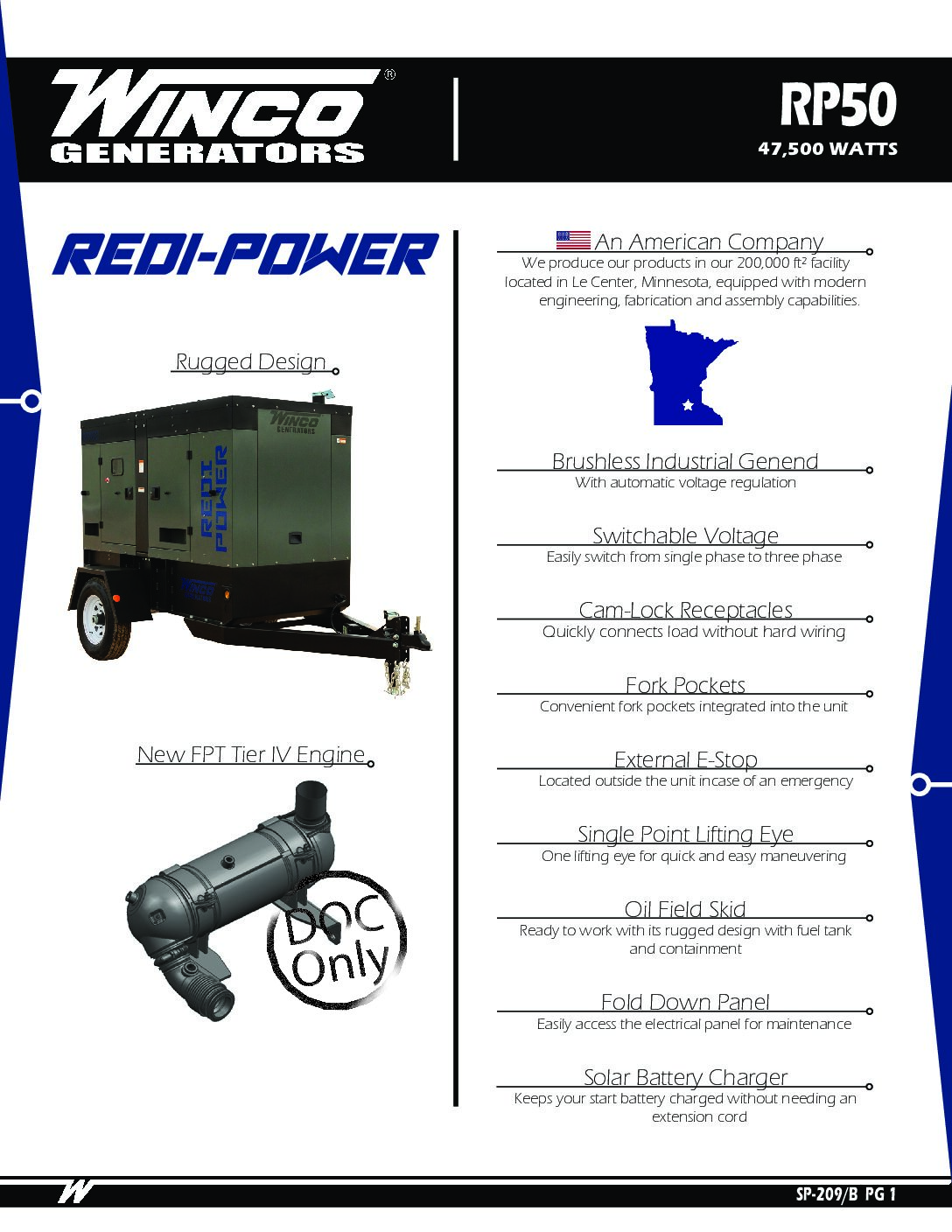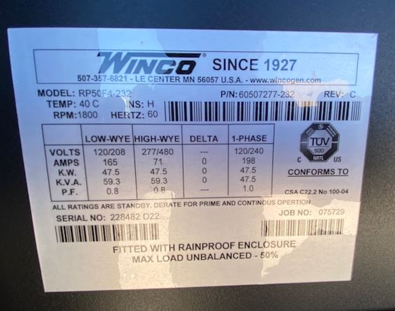 50 KVA, 47KW Prime ; Winco Portable Generator Mdl: RP50F4-232; FPT F5C 3.4L Diesel Engine Voltage Selector Switch; DSE7310; 95 gal ; Sound-Pak, Tier IV Final ; Battery Grp, 12V; single Axle
